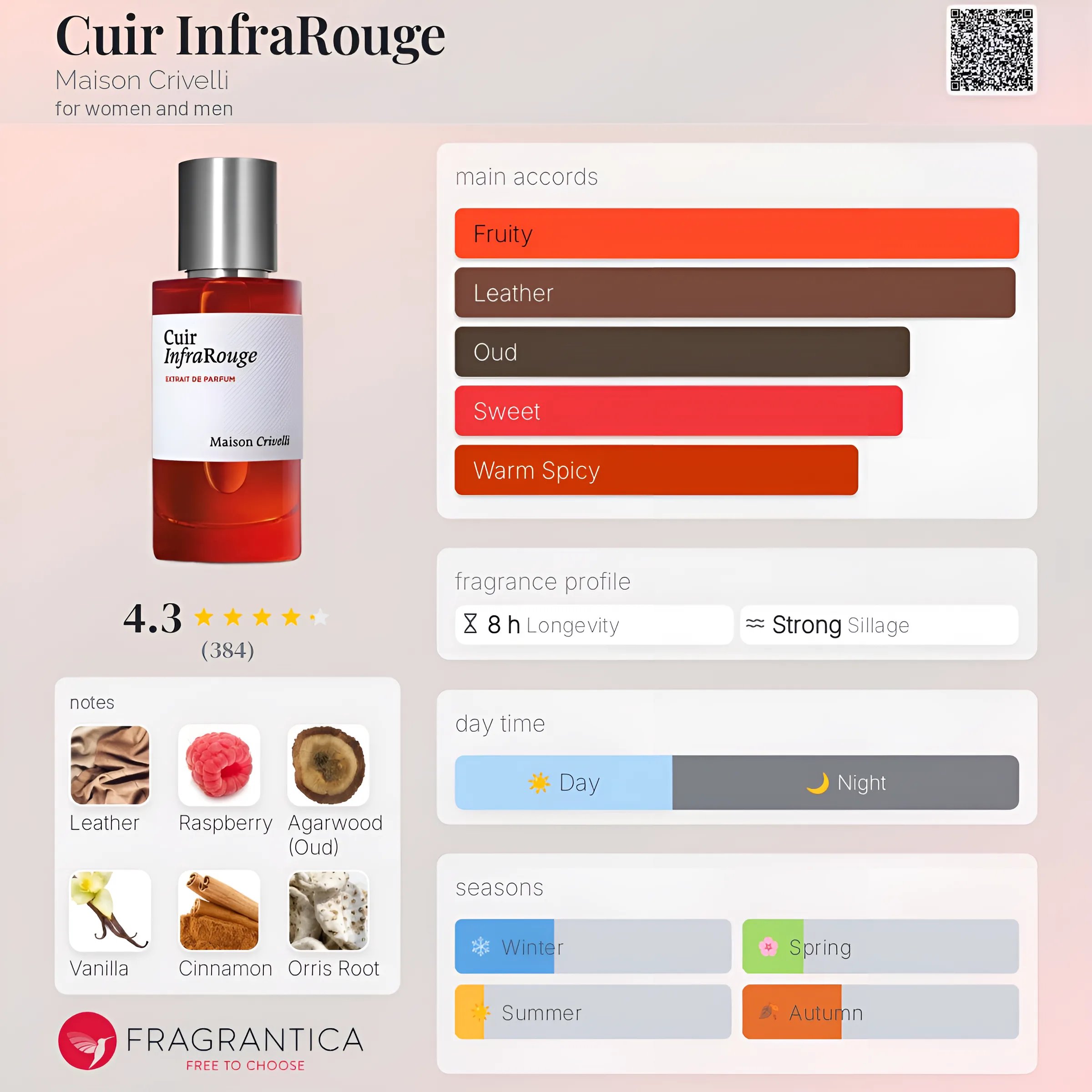 Cuir InfraRouge de Maison Crivelli est un parfum Cuir pour homme et femme. C’est un nouveau parfum. Cuir InfraRouge a été lancé en 2024. Le nez derrière ce parfum est Jordi Fernández. Les notes de tête sont Framboise, Cannelle et Bergamote; les notes de coeur sont Racine d’iris, Osmanthus et Cèdre; les notes de fond sont Cuir, Oud, Vanille et Patchouli.
