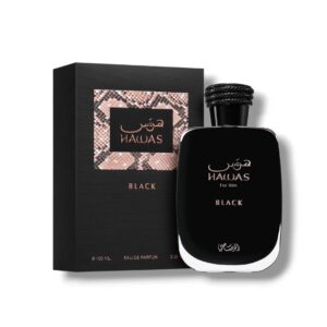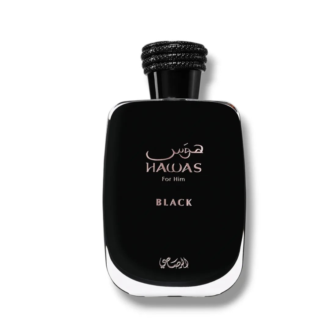 Hawas Black de Rasasi est un parfum aromatique fruité pour homme. C’est une nouveauté, lancée en 2024. Ses notes de tête sont la bergamote, l’ananas et le pamplemousse ; ses notes de cœur, le patchouli, le bois de cèdre et le jasmin ; et ses notes de fond, la mousse de chêne, les notes boisées et l’ambre.